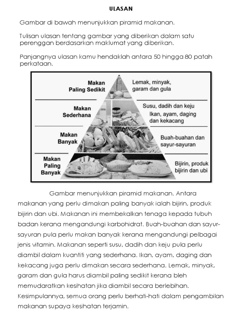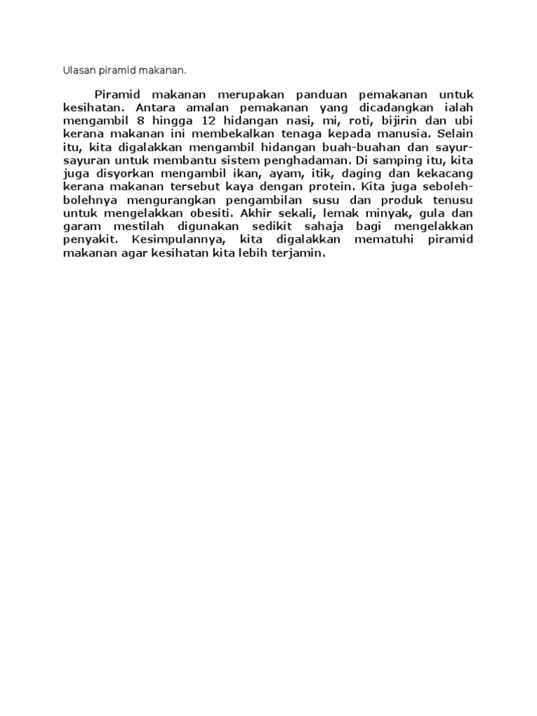 Https Www Tcer My Wp Content Uploads 2020 12 Contoh Penulisan Ulasan Pdf from Di dalam setiap hidangan, makanan daripada kumpulan iniperlu diambil paling banyak. 7/24/2019 2.4.3 ulasan piramid makanan 1/62.4.3membaca danmemahami maklumatyang tersurat dantersirat untuk membuatulasan7/24/2019 2.4.3 ulasan piramid makanan 2/67/24/2019… Piramid makananmakanan di bahagian atas piramid, khususnya minyak, lemak, gula dan garam hendaklah dikurangkan berbanding di bahagian. Piramid makanan merupakan panduan pemakanan untuk kesihatan. Antara amalan pemakanan yang dicadangkan ialah mengambil 8 hingga 12 hidangan nasi, mi, roti, bijirin dan ubi kerana makanan ini membekalkan tenaga kepada. Piramida rantai makanan menggambarkan hubungan antar organisme dalam hal jumlah, biomassa dan aliran energi pada tiap kelompok trofiknya. Ada yang sudah mengenal atau pernah mendengar mengenai istilah piramida. Contoh karangan ulasan piramid makanan tentang pemakanan seimbang untuk kesihatan dan gaya hidup sihat.