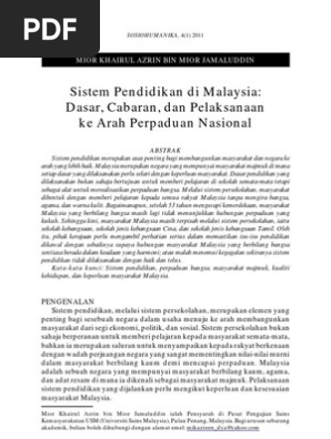 Namun setelah sistem pendidikan kolonial diperkenalkan tidak dinafikan bahawa sistem ini telah mempengaruhi pembangunan negara yang masih dikuasai olehpenjajah pada masa itu. Sekolah memainkan peranan penting dalam menjalinkan hubungan baik dan saling toleransi. Sistem pendidikan di malaysia telah berjaya menyatupadukan masyarakat pelbagai etnik sistem pendidikan merupakan satu wadah penting dalam mencapai perpaduan antara kaum di malaysia. Sejarah perkembangan sistem pendidikan di malaysia. Image via kementerian pendidikan malaysia. Dasar, cabaran, dan pelaksanaan ke arah perpaduan nasional abstrak sistem pendidikan merupakan asas penting bagi membangunkan masyarakat dan negara ke arah yang lebih baik. Malaysia merupakan negara yang mempunyai masyarakat majmuk di mana setiap dasar yang dilaksanakan perlu selari dengan keperluan masyarakat. Pendidikan malaysia bertaraf dunia malaysia ke arah pendidikan bertaraf dunia yang telah diilhamkan oleh y a bhg tun abdullah ahmad badawi mantan perdana malaysia di sidang kemuncak pendidikan 2004 beliau menyatakan membangunkan sistem pendidikan bertaraf dunia merupakan agenda kerajaan saya. Ia bertujuan menyediakan metodologi yang mantap untuk memahami dan membandingkan standard dan prestasi sistem pendidikan malaysia dengan negara lain. Kementerian pendidikan malaysia abstrak pemimpin dalam dunia pendidikan menggalas tanggungjawab besar dalam memastikan matlamat dan agenda pendidikan dapat dilestarikan. Malaysia melalui sistem pendidikan pertama ialah pembinaan budaya ilmu dan keduanya ialah pembudayaan masyarakat. Beberapa inovasi telah dilaksanakan dalam pengurusan pendidikan di malaysia terutama di peringkat sekolah bagi meningkatkan kecekapan dalam pengurusan pendidikan. Dasar cabaran dan pelaksanaan ke arah perpaduan nasional.